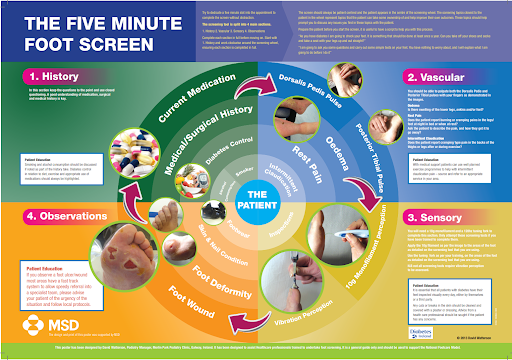 The percentage of the population diagnosed with Diabetes is ever increasing. The complications associated with the Diabetic Foot are well known and can be very serious for patients. Full examination, assessment of the feet will be undertaken that will include a full Diabetic foot assessment. (Neurological and vascular assessment) Full nail care, debridement of corns and callus will be completed as required. A management plan will be agreed that may include regular foot care appointments, skin care, Footwear advice, pressure offloading using insoles, use of other medicinal products as required. The overall aim is to prevent Diabetic Foot complications through good patient education, regular foot care, and referral into the public health service when issues have been identified.